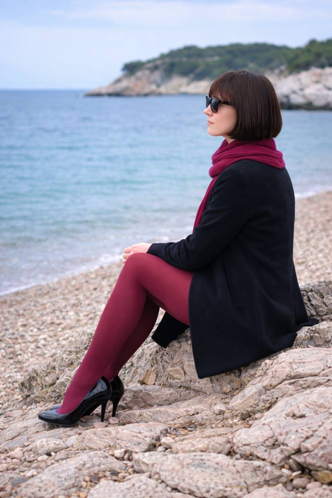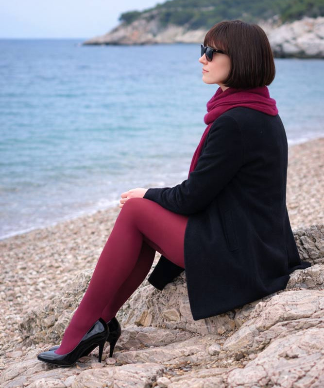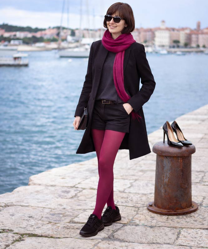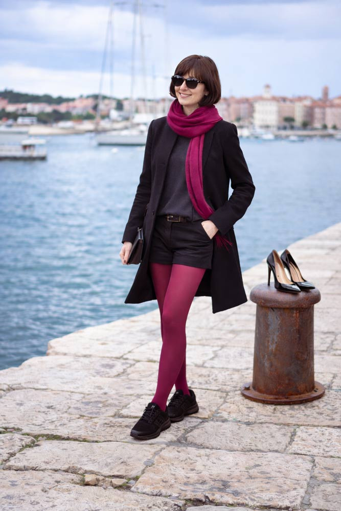 Priznam, najprej sem bila skeptična. Fuksija? Ali ni to preveč opazno, preveč drzno, preveč »ne jaz«? Zato sem se odločila za najvarnejši možni eksperiment. Vse ostalo sem pustila črno in sivo: plašč, obleka, čevlji. Ena sama barvna točka – hlačne nogavice v fuksiji. In nenadoma je bil outfit popolnoma drugačen. Še vedno umirjen, a z značajem.