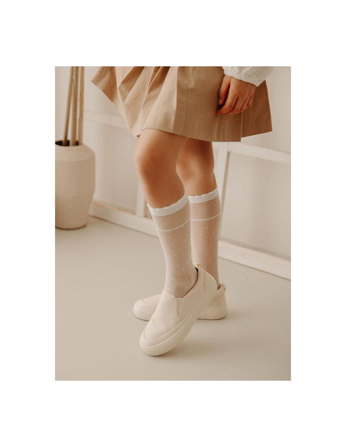 Klasične otroške nogavice do kolen z vzorcem pikic in mrežastim motivom ter dekoriranim robom oziroma manšeto. So eleganten dodatek za prvo obhajilo, primerne pa so tudi za bolj sproščene priložnosti. Visokokakovostna mat tkanina s prijetnim otipom surove svile. Neopazno ojačan gladek del prstov. Tkane iz preje vodilnih evropskih proizvajalcev.